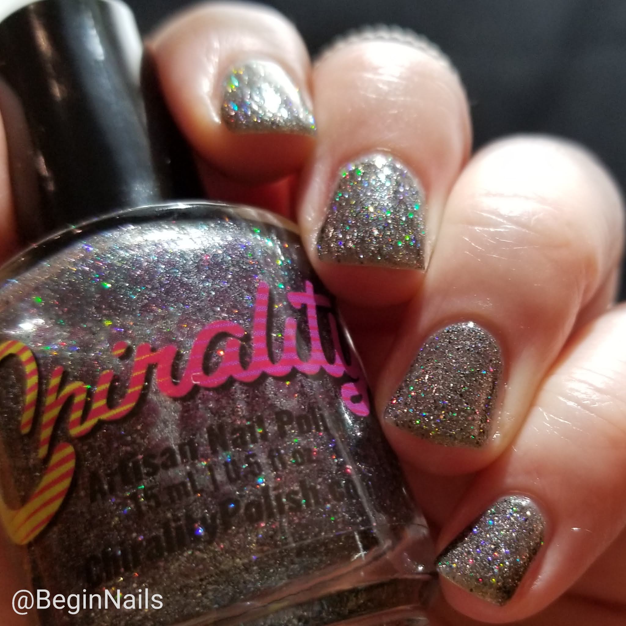 Brand Description: sheer gunmetal grey polish filled with sparkling silver pops, holographic silver and pewter micro glitters, grey microflakes, and holographic black microglitter.